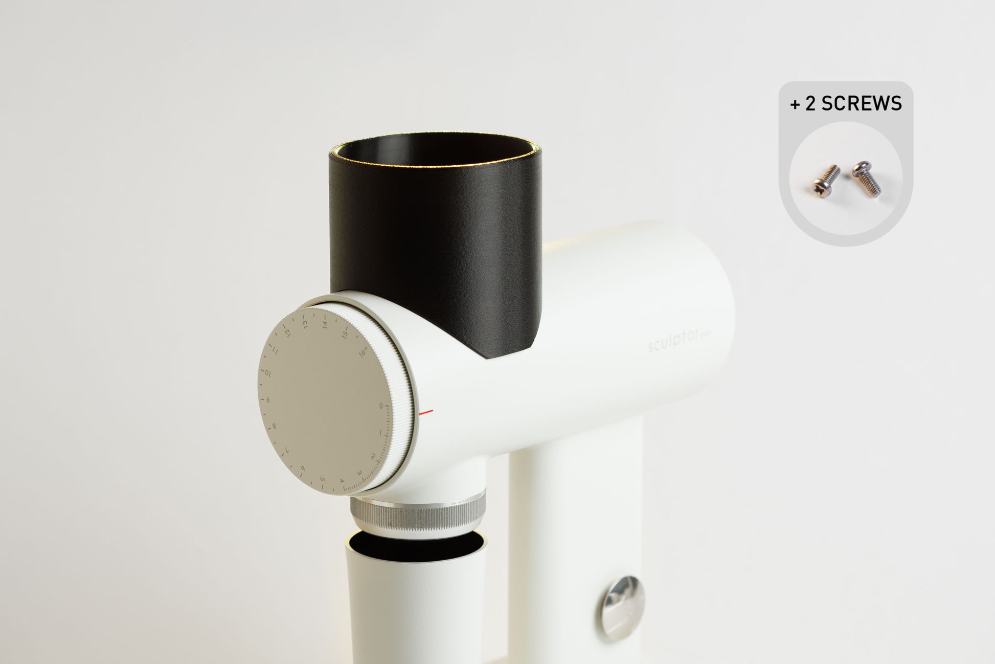 Matching Aesthetics. The single dose hopper replaces the original stock hopper while maintaining its cylindrical aesthetic motifs, with a textured outer surface to match the grinder's surface.