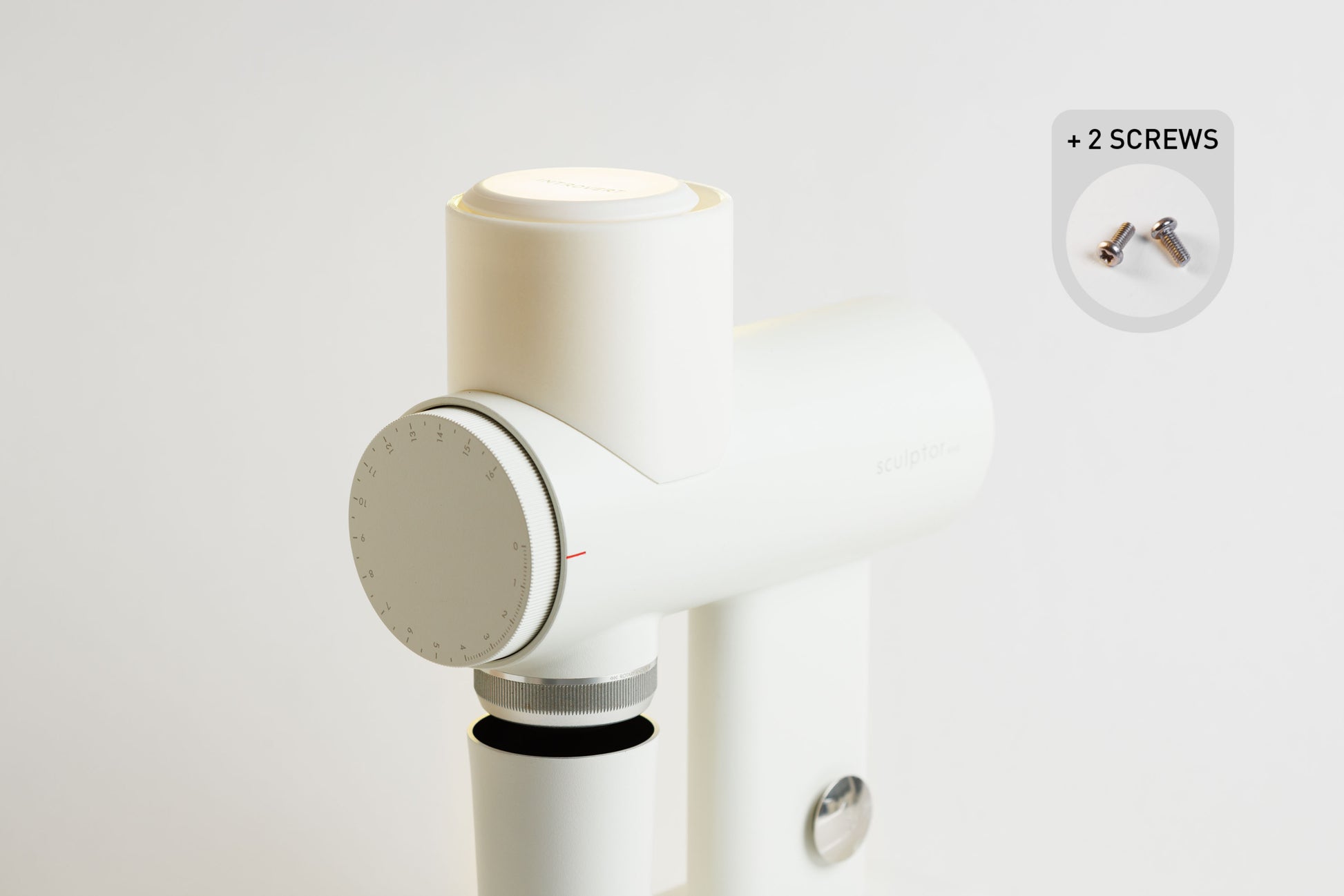 Although you can use the 2 stock screws that come with the grinder to secure this hopper, they can easily strip, so take extra caution when removing and screwing in the hopper. Use a screwdriver that fits the screw shape exactly. Do not over-tighten. In the event of needing a replacement for the screw, use a M2.5 screw that has a length of about 6.7mm in length. The diameter of the head should be smaller than 5.0mm to fit into the hole. For reasons unknown, the stock screw heads have a square shape, which makes it an extra tight fit in the screw holes of this hopper in some situations.